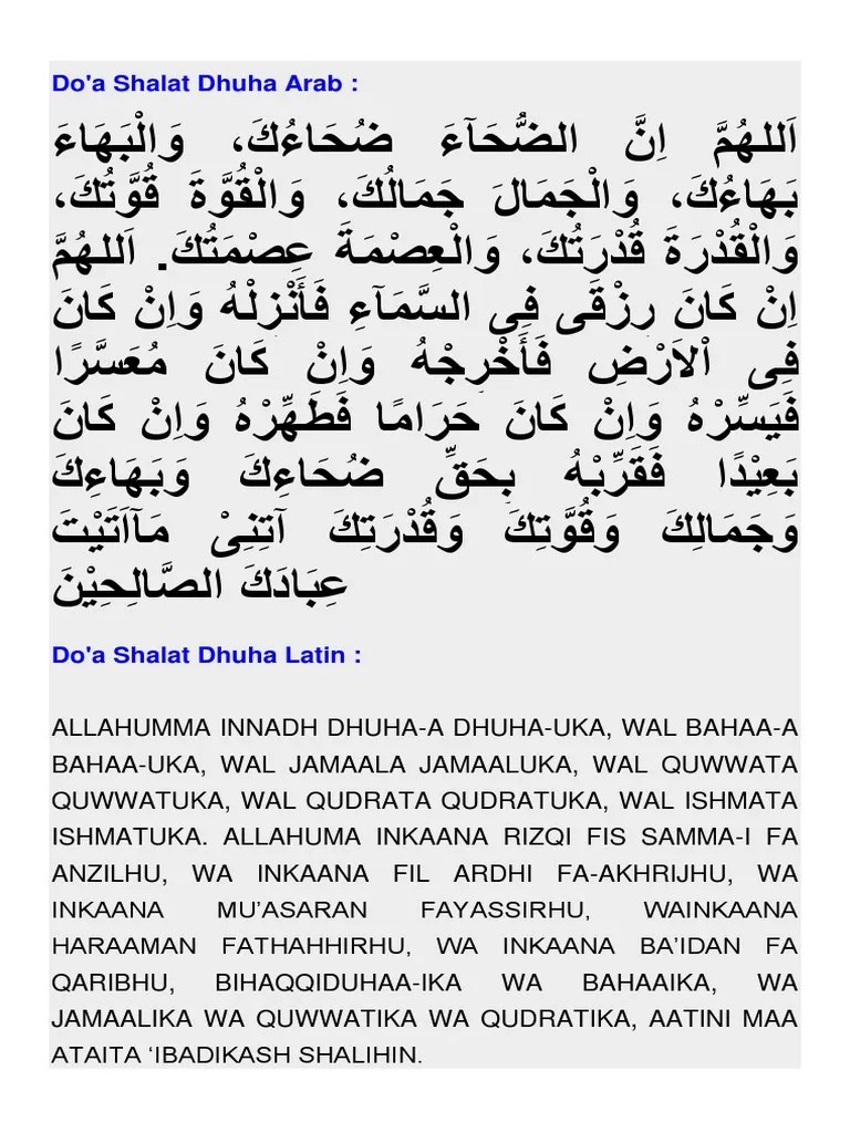 Aku niat shalat sunat dhuha dua raka'at, karena allah ta'ala. Doa setelah sholat dhuha 2. Bacaan doa setelah shalat dhuha. Dilansir deskjabar.com dari buku 'risalah tuntunan sholat lengkap" karya drs. Setelah itu maka bacalah doa setelah sholat dhuha.